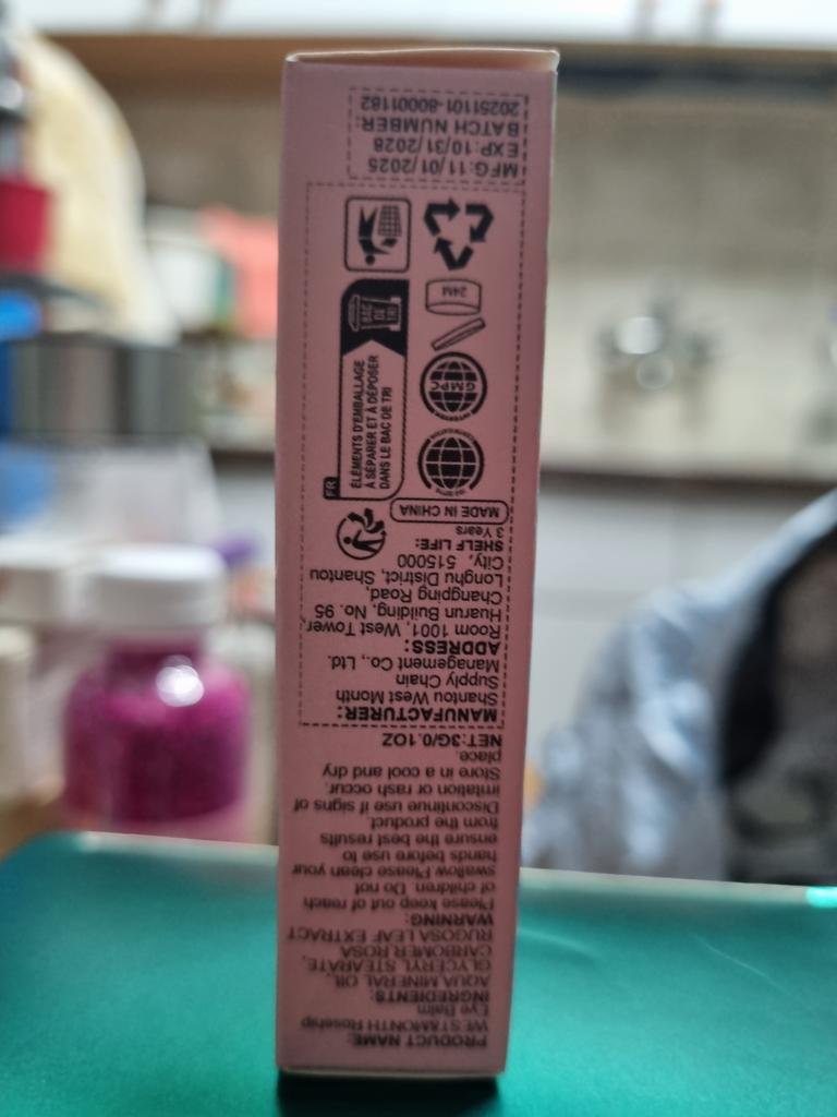 water, mineral oil, glycerin stearate, carbomer, rose leaf extract