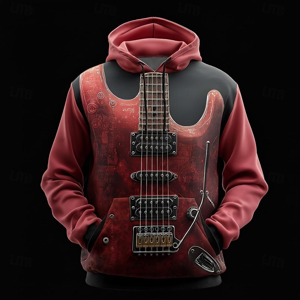 Men's Optical Illusion Guitar Hoodie Sweatshirt Fashion Cool Crew Neck Home Party Streetwear Red Orange Drawstring Fall Winter Designer
