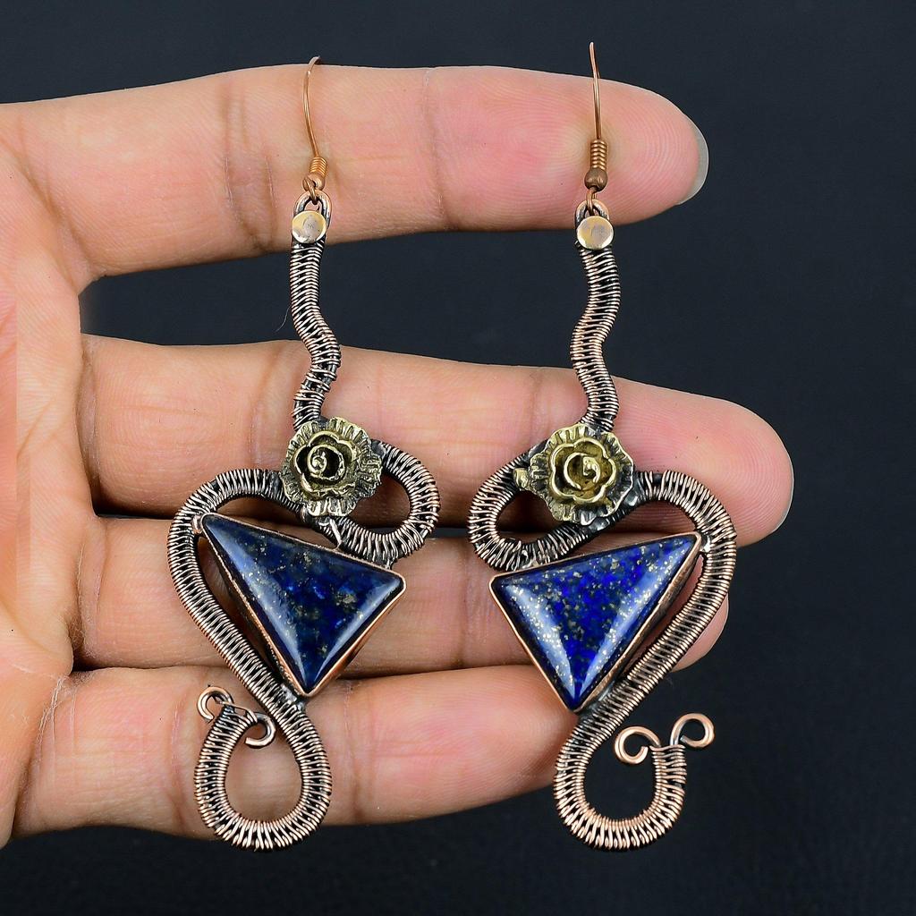 Lapis Lazuli 999 Copper Wire Wrapped Earrings, Handmade Gemstone Earrings Jewelry, Gifts For Wife Brand New Earrings