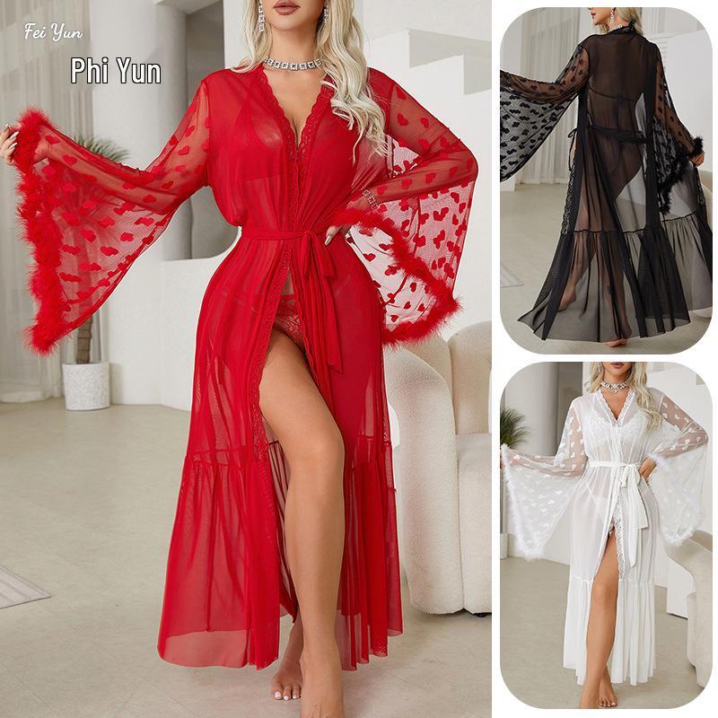 This alluring nightgown and bathrobe set is designed to elevate your nighttime wardrobe. Crafted from delicate mesh material, it offers a seductive, breathable look and feel. The set features intricate detailing that adds a touch of elegance and sophistication, making it perfect for a cozy evening at home or for impressing that special someone. The lightweight mesh fabric drapes beautifully, ensuring both comfort and style.