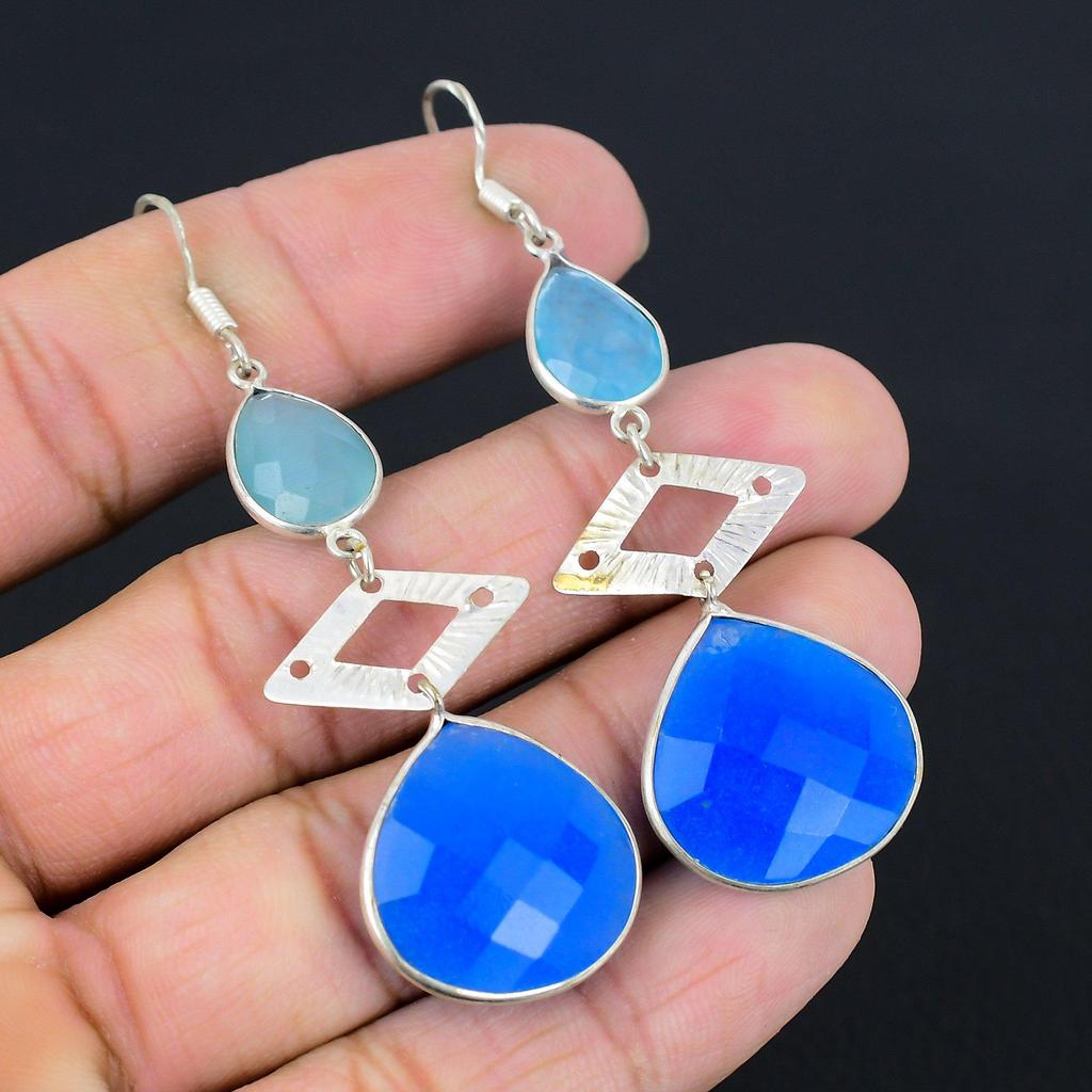 925 Sterling Silver Blue Sapphire Stone Dangle Drop Wife Hook Earrings Jewelry