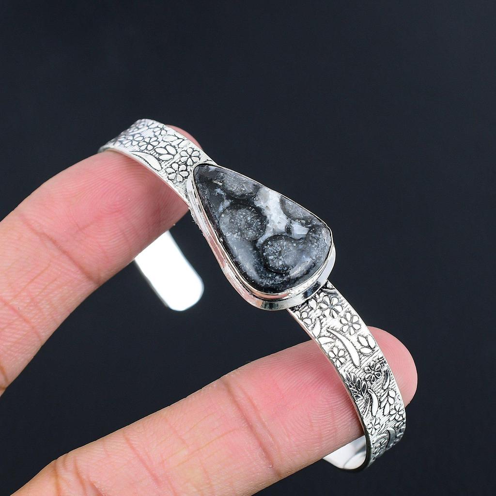 Natural Black Fossil Coral Gemstone Bangle Adjustable 925 Sterling Silver