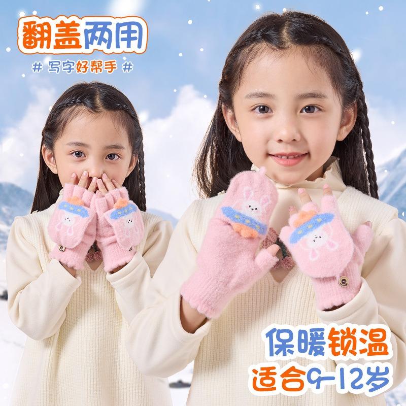 Gloves Girl Middle School Children Autumn and Winter Cartoon Cute Half Finger Flip Writing Knitted Wool Cold-proof Warm Children's Gloves