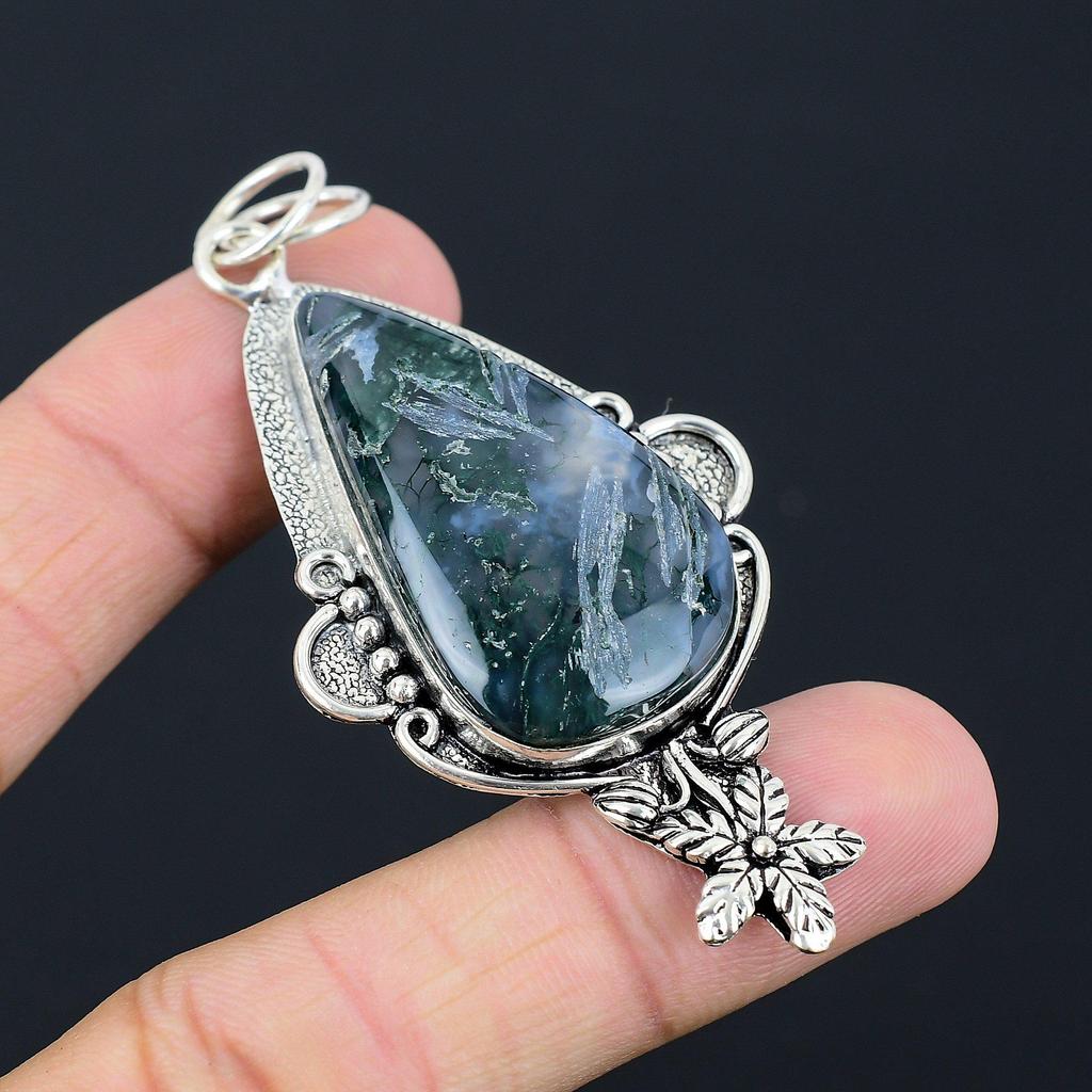 Gift For Women Pendant Flower 925 Silver Natural Carved Solar Moss Agate