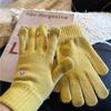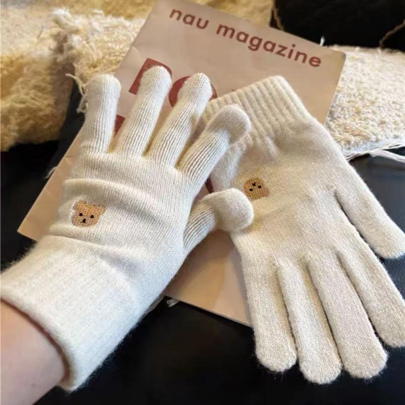 New Autumn and Winter Cute Bear Embroidery Wool Knitted Five-finger Gloves Finger-revealing Female Solid Color