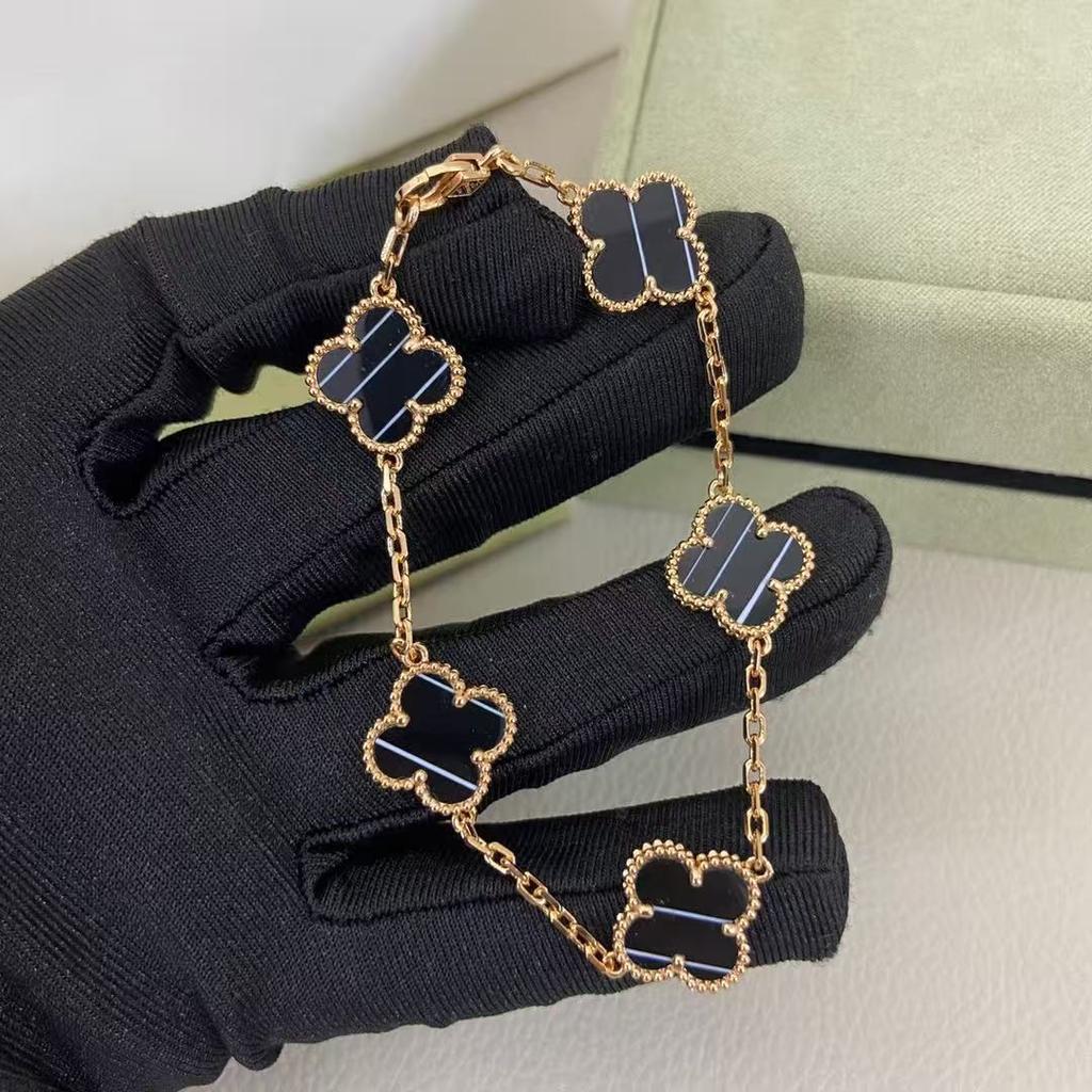 Women's Four-leaf Clover Bracelet 18k Rose Gold High Version Striped Black Chalcedony Lucky Clover Bracelet