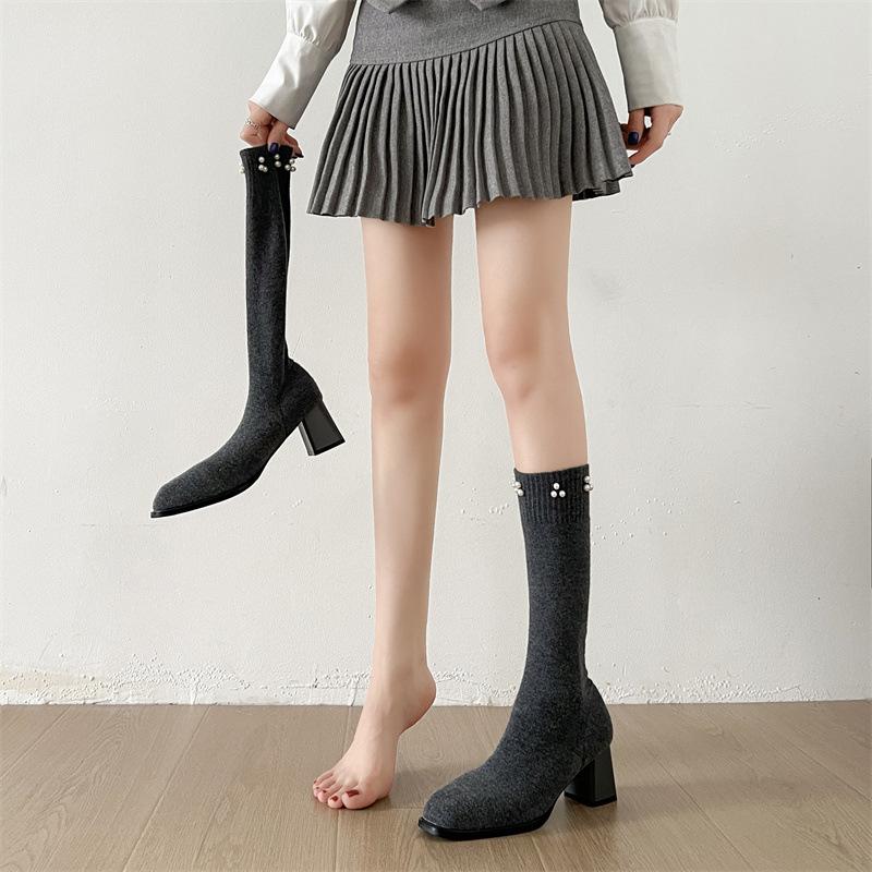 Fashion Versatile Retro Square Head Thick Heel Heightened Boots 2025 Autumn and Winter New Simple Pearl Fashion Boots and Socks Boots