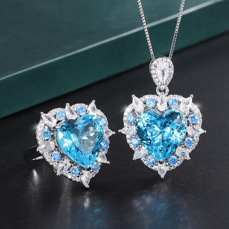 Jewelry Copper Bottom Gold Plated Ocean Heart Set Simulation Aquamarine Pendant Ring Set Main 15 * 15