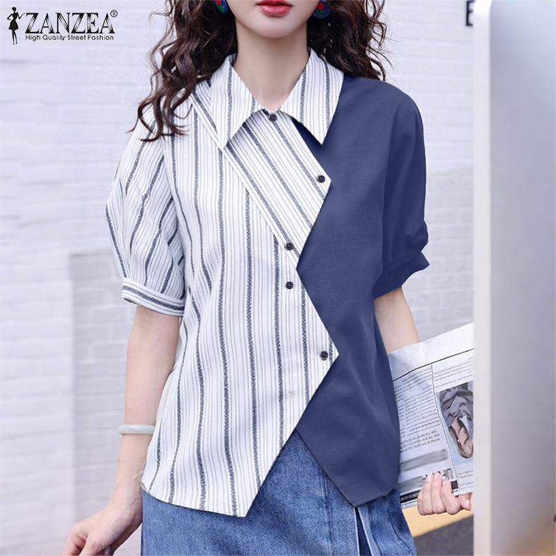ZANZEA Women Casual Turn Down Collar Summer Short Sleeve Stripe Blouse