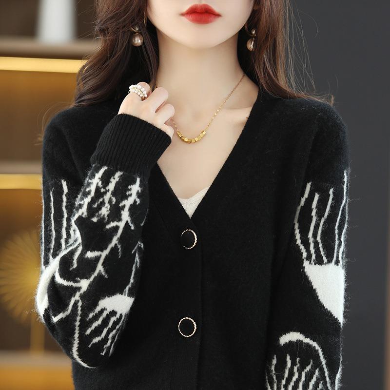 Autumn and Winter New Cardigan Women's Black and White Color Matching Knitted Sweater Short Top Jacket