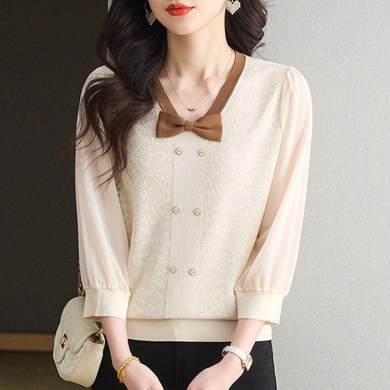 Bow Medium-sleeved Women's Spring and Summer New Chiffon Seven-quarter-sleeved Knitted Top To Cover the Belly and Show Thinness