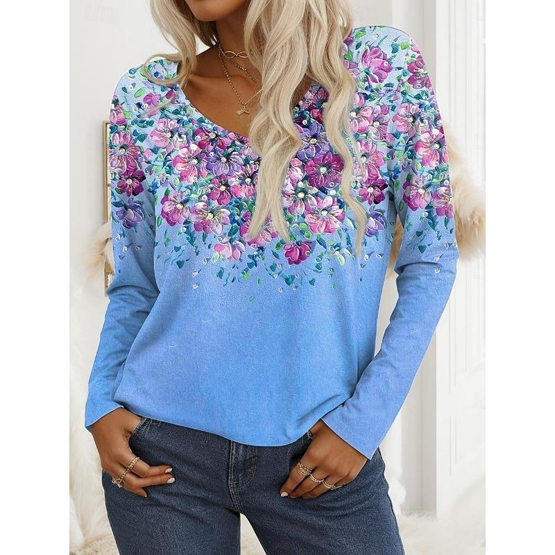 2025 Women's T-Shirt Floral Graphic Flower Elegant Trendy Tees V-Neck Long Sleeve T-shirtsRegular Tops Pullover Fall Winter