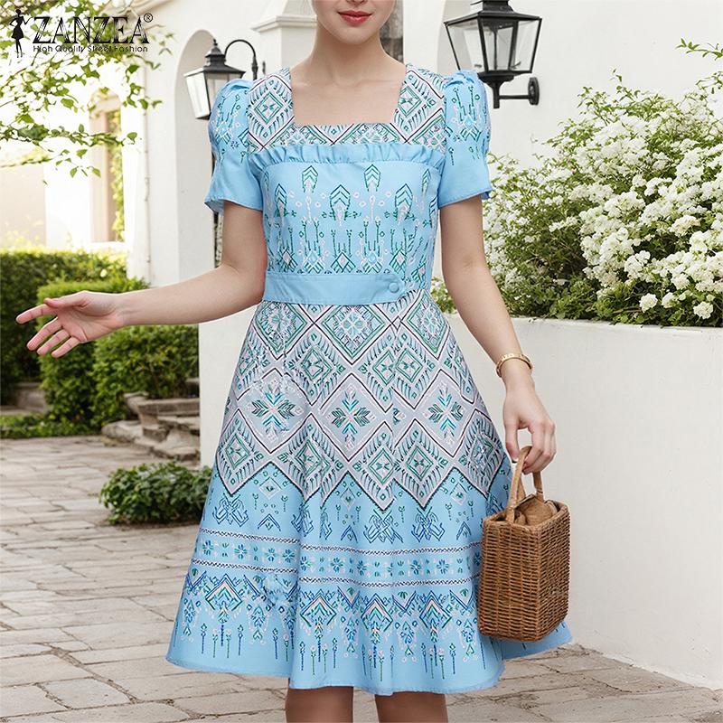 ZANZEA Women Summer Square Collar Casual Short Sleeve Print Dress