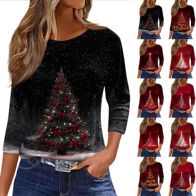 Women's Fashion Casual 3/4 Christmas Print Color Shirt Women's Round Neck Tops