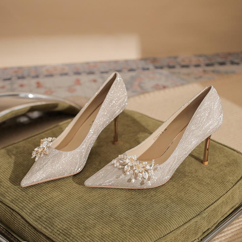 860-6 High Heels Women's Stiletto 2025 New Crystal Bridal Wedding Shoes Pointed Wedding Dress Xiuhe Shallow Mouth Single Shoes