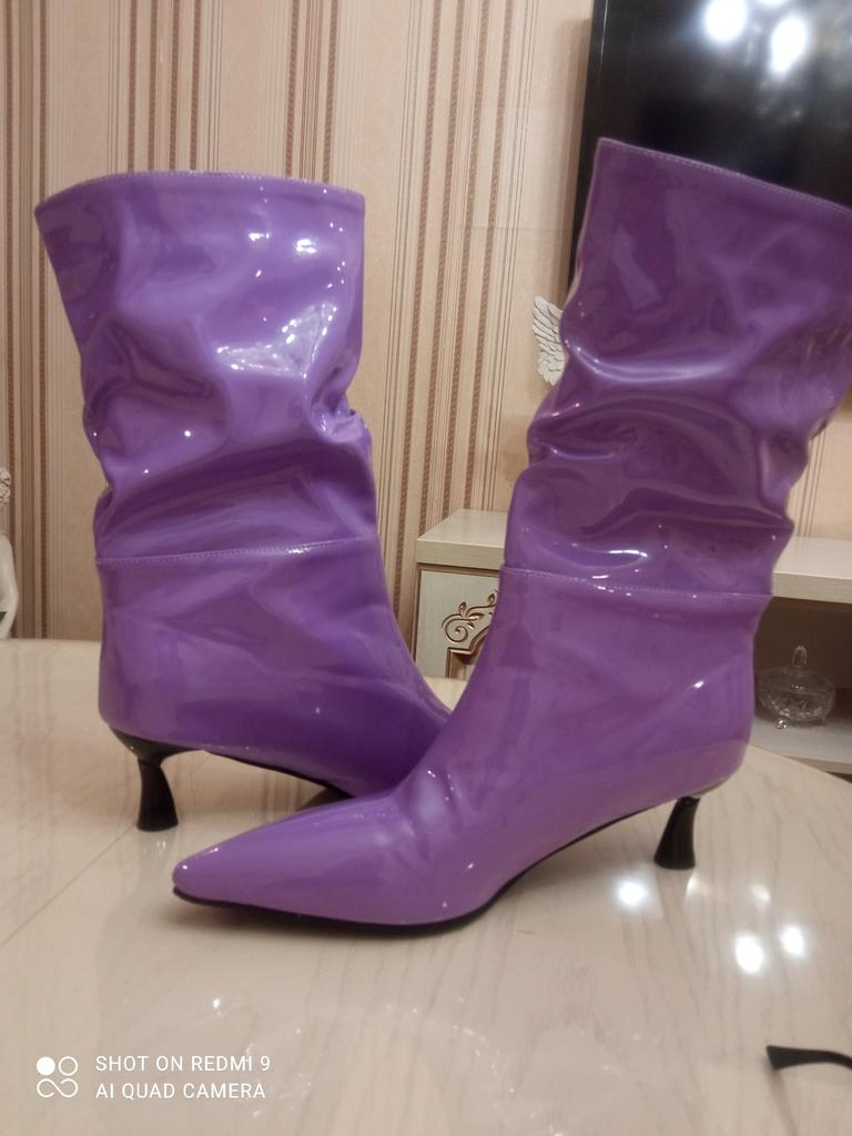 FOREADA Women Patent Leather Mid Calf Boots Pointed Toe Thin High Heels Pleated Ladies Fashion Shoes Autumn Winter Rose Red 46