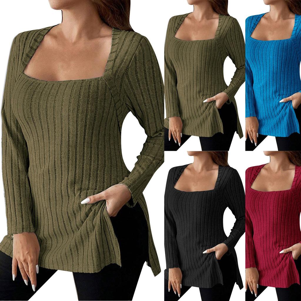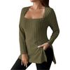 Women's Plus Size Casual And Fashionable Square Neck Long Sleeved Slit Top Slit Top