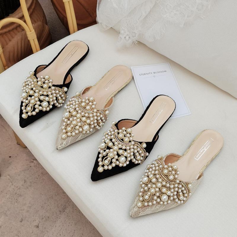 Fashion Elegant Pearl Beaded Slippers Women Brides Wedding Shoes Closed Pointed Toe Flat Sandals Ladies Home Pantuflas Lace Mules Slides