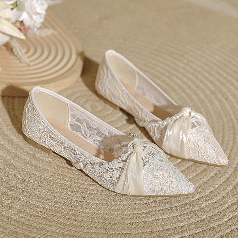 Fashion Wedding Shoes Woman Sexy Lace Flats Pearl Beading Ballerian Shoes Pointed Toe Cutout Moccasins 35-43 Big Size Crystal Loafers