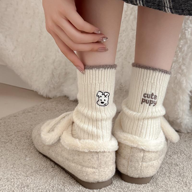 Ladies Autumn Winter Thickened Warm Cartoon Dog Embroidered AB Style Wool Tube Stack Socks