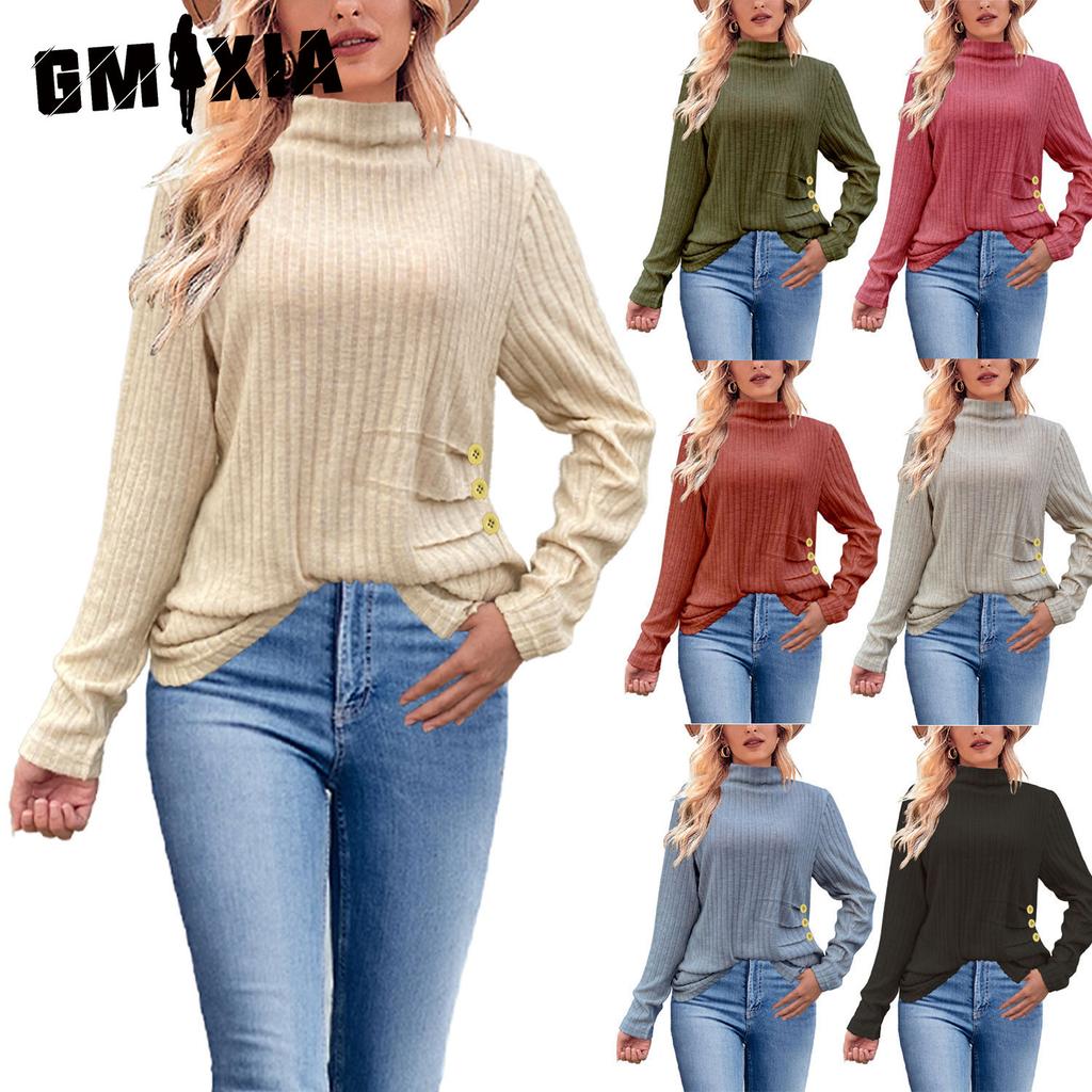 GMXIA Women's Autumn and Winter Frosted Striped Knitted High-neck Side-buttoned Women's Top Sweaters
