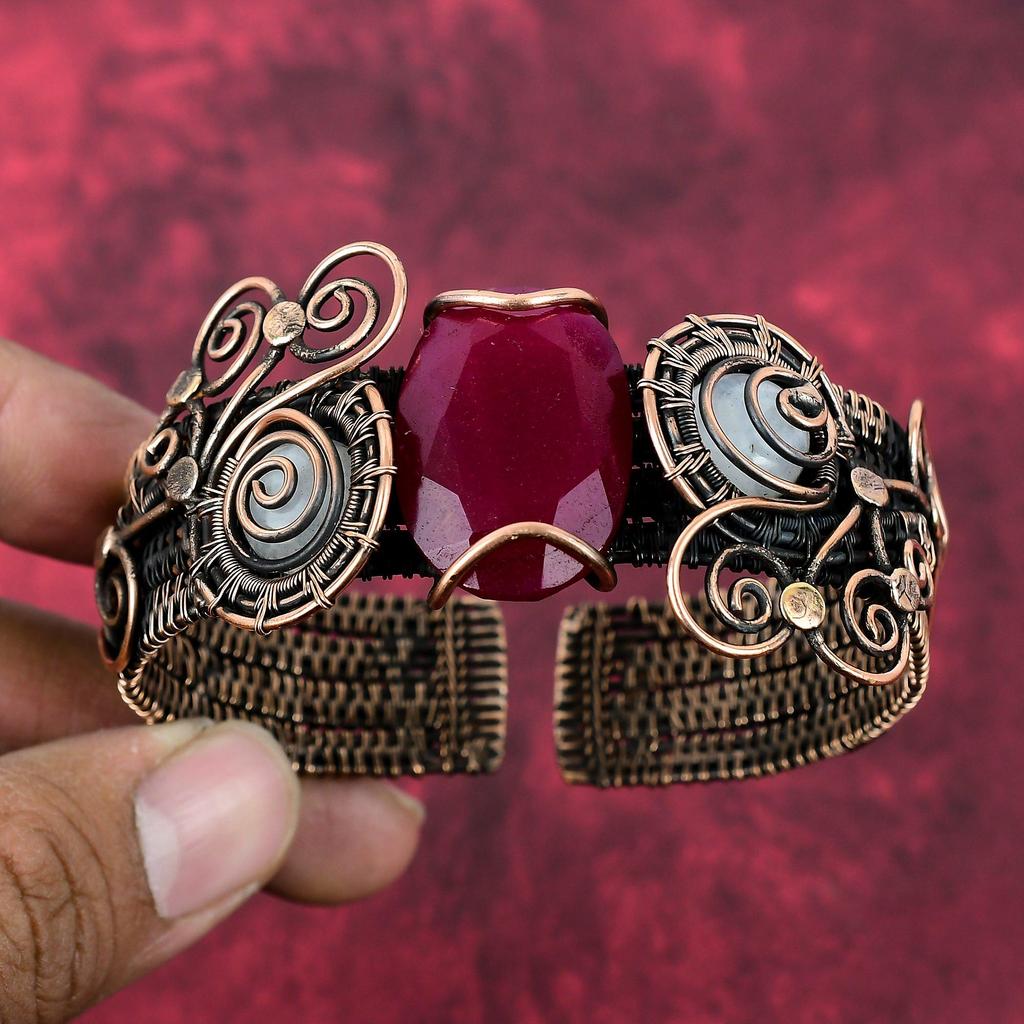 Faceted Kashmir Ruby Bangle Rainbow Moonstone Cuff Bracelet Copper Wire Wrapped Adjustable Bangle Handmade Copper Jewelry Gemstone Bracelet