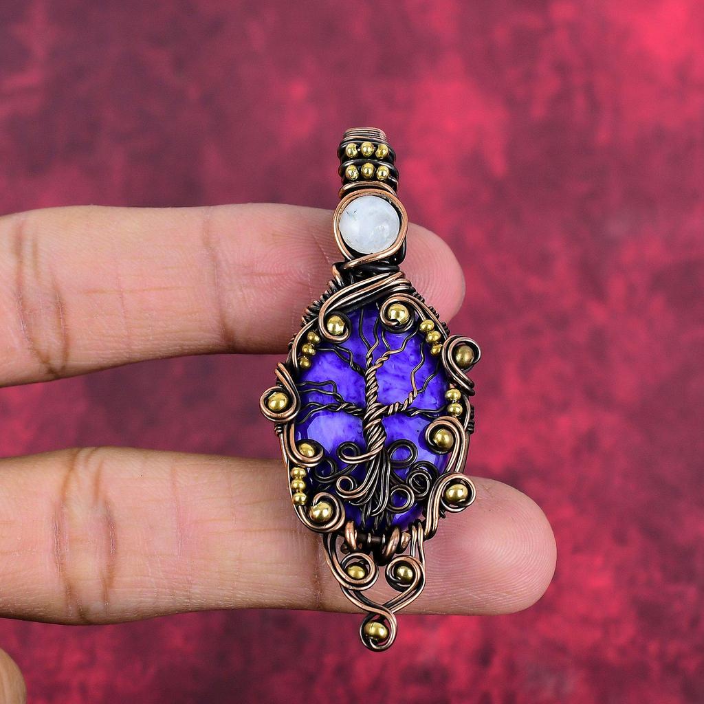 Tree of Life Charoite Pendant Copper Wire Wrapped Jewelry Rainbow Moonstone Gemstone Pendant Handmade Jewelry for Gifts Copper Wire Pendant