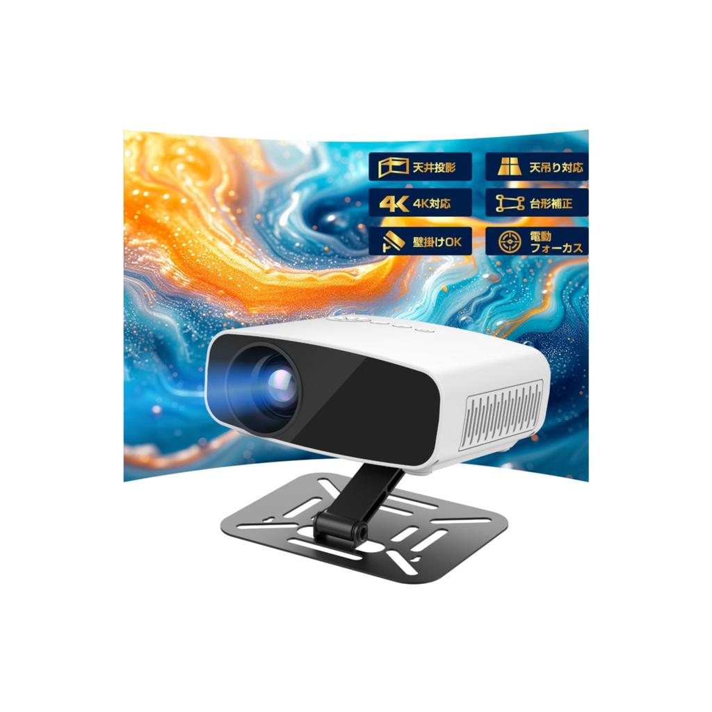 VOSCORDER Compact Projector with Ceiling Projection, 180° Rotation, Stand/Ceiling Mount/Wall Mount Included, Wired Mirroring, 1080P 4K Support, 20,000LM, Short Distance Projection, 50% Zoom, Bluetooth 5.3, HiFi Speaker, Large Screen, Compatible with Smartphones, PCs, DVD Players, and Switches, Japanese Instruction Manual Included