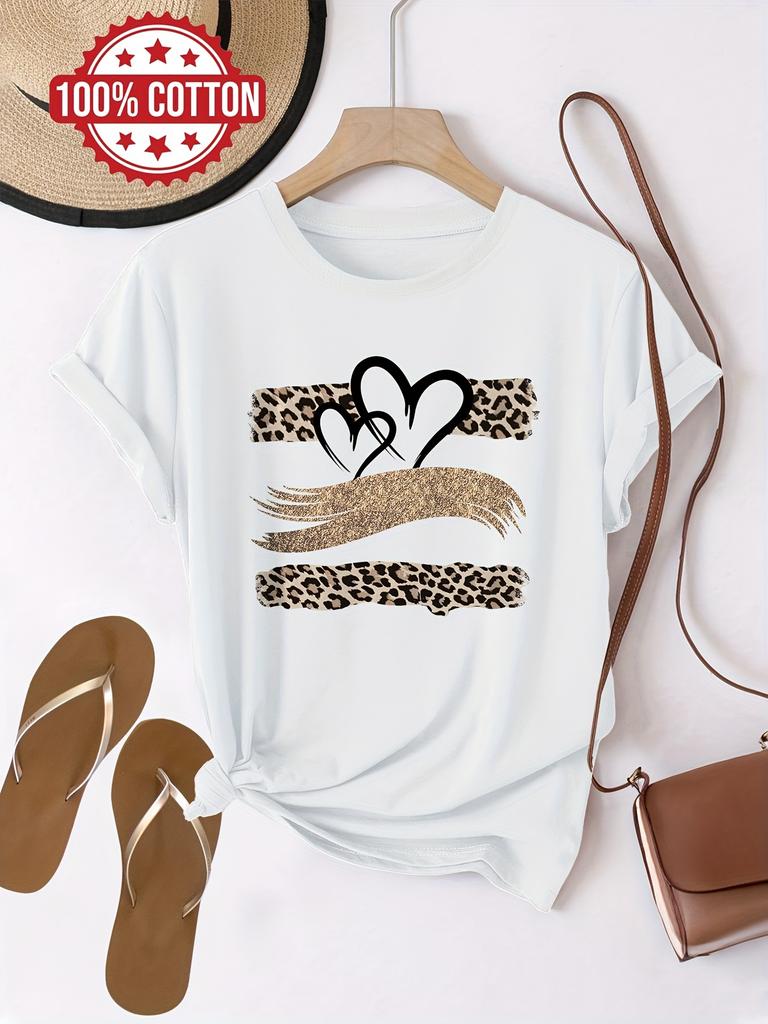 Women'S Casual T-Shirt with Leopard Print Heart Graphic Short Sleeve Crew Neck Top for All Seasons Urban Style Printed T-Shirt