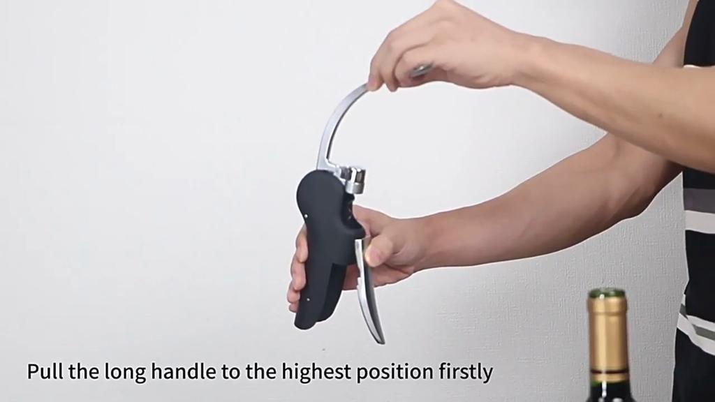Grasp the silver trigger, lift the handle and press down to make the spiral cone penetrate the cork completely