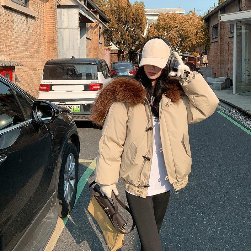Women’s Short Hooded Windproof Thicken Warm Winter Jacket With Big Fur Lapel