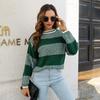 Women Casual Contrast Color Striped Sweater Round Neck Long Sleeve Knitted Pullover for Autumn Winter