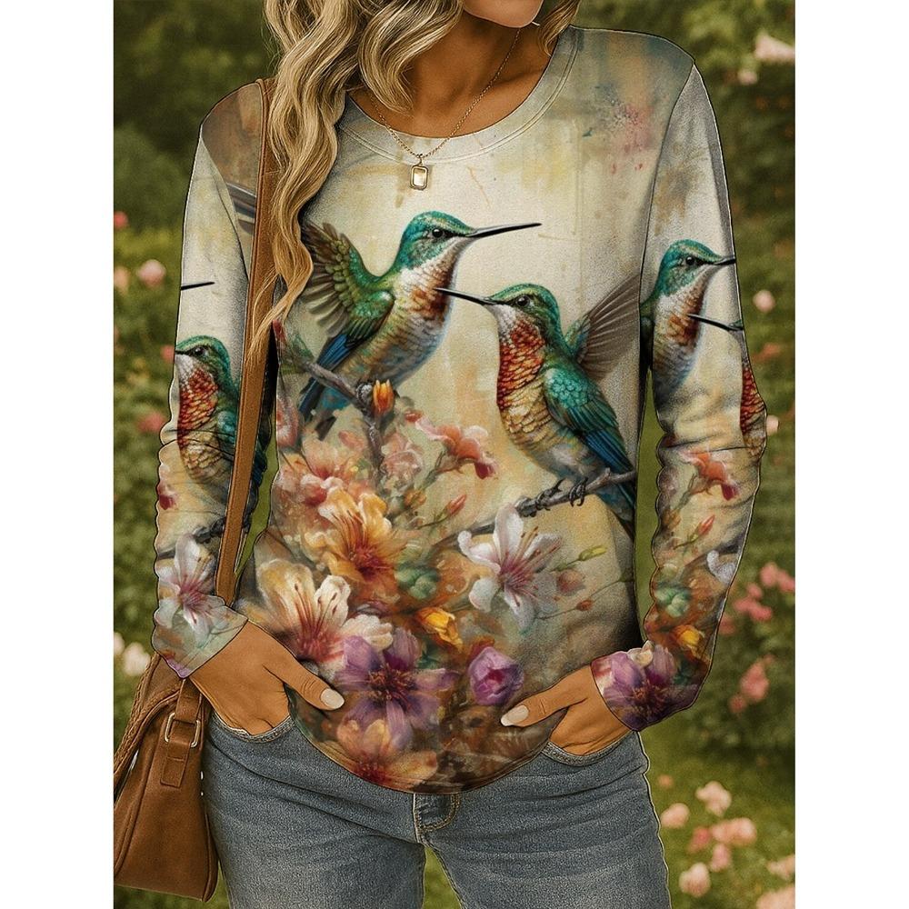Women's T Shirt Floral Graphic Bird Tees Fashion Stylish Long Sleeve Crew Neck Regular Tops 3D Printed Summer Casual Pullover