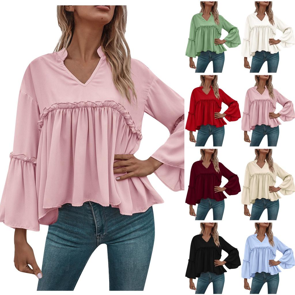Womens Fashion Casual Solid Color V-Neck Flared Sleeve Chiffon Top