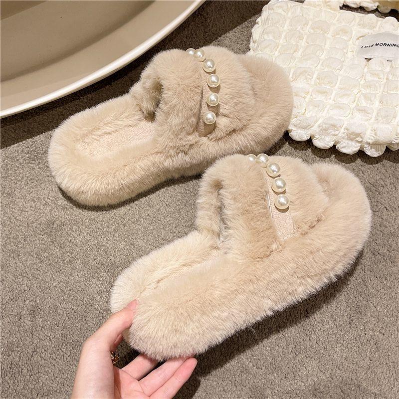 Internet Celebrity Pearl Fluffy Slippers Women Wear Thick Bottom Ins Tide 2025 New Autumn and Winter Versatile Household Dormitory Cotton Mop