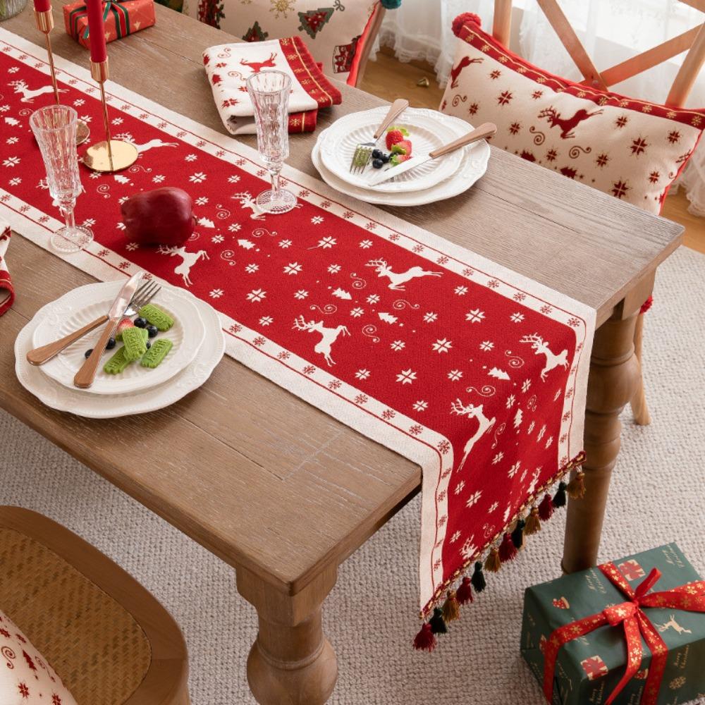 Red Christmas Table Runner Woven Jacquard Xmas Tree Holiday Bed End Flag Dresser Coffee Table Cover
