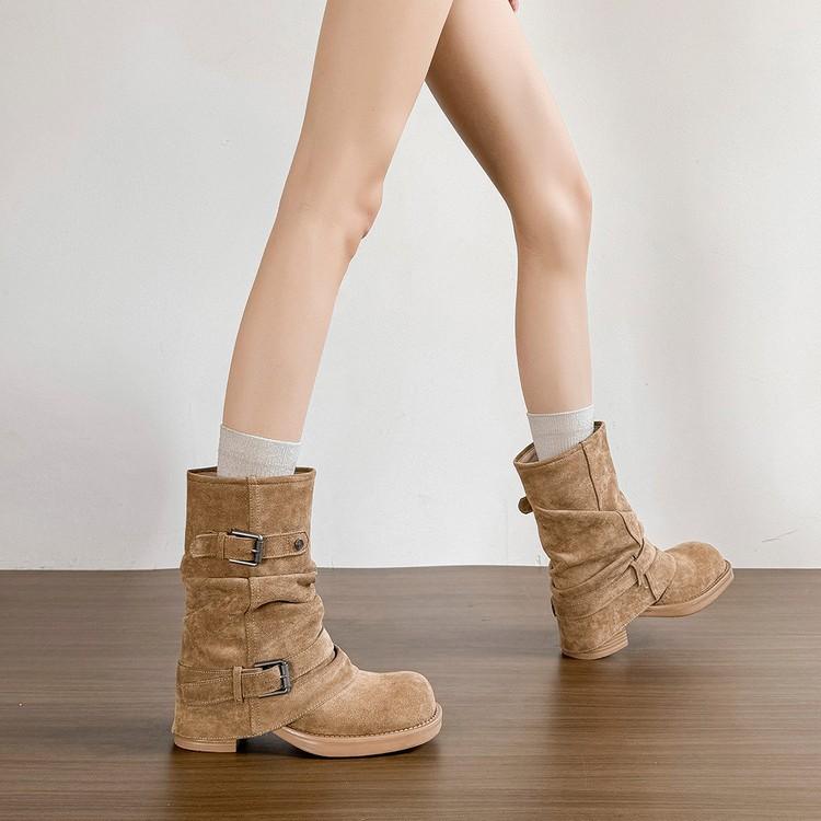 Soft Leather Version! Thick Heel Pleated Pile Booties Women's Autumn and Winter Maillard Vintage Western Trousers Martin Boots