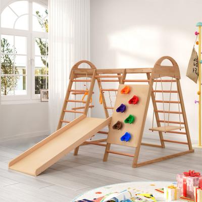 FUNLIO 4-in-1 Wooden Kids Swing & Slide Set, Foldable Montessori Jungle Gym for Kids, Indoor Playground with Swings, Slide, Ladder, and Climbing