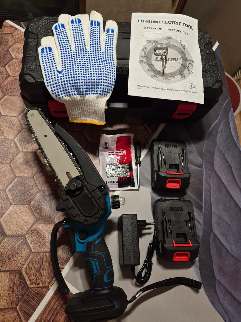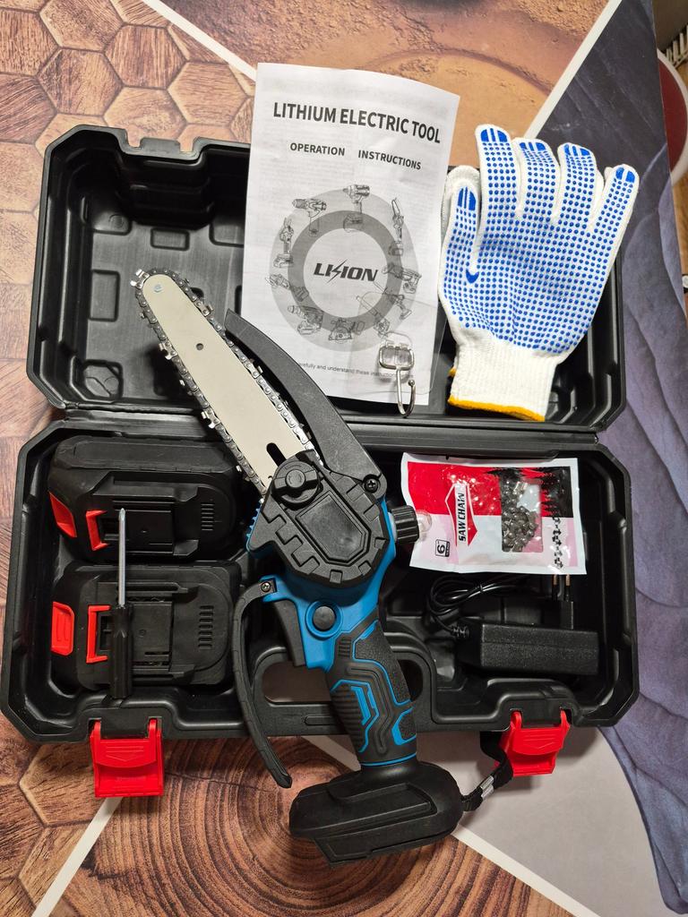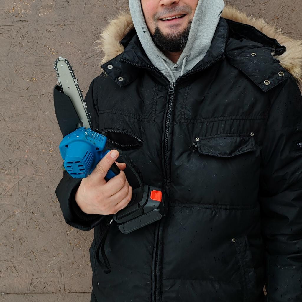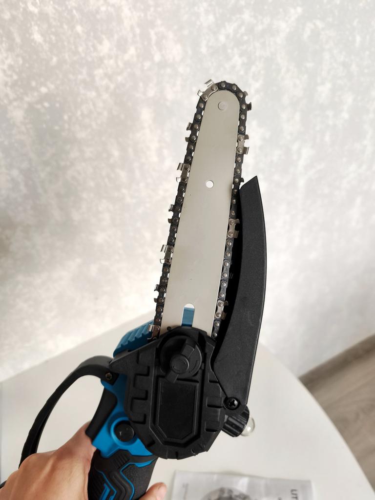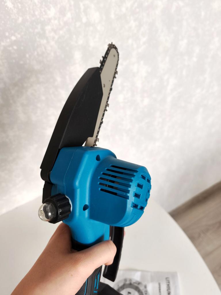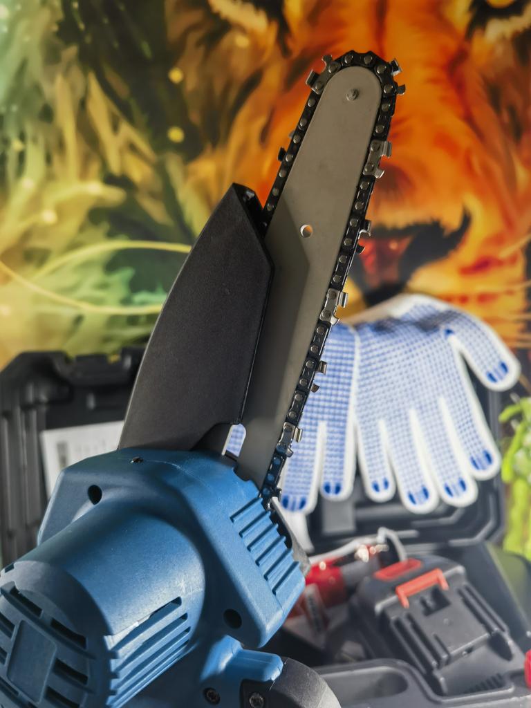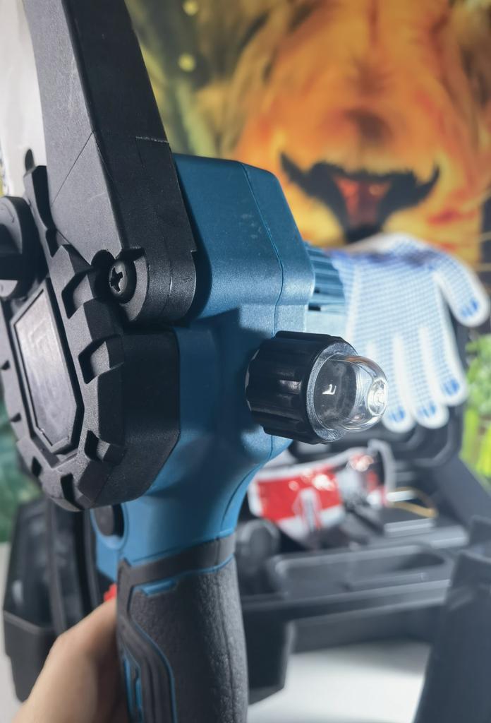This chainsaw features a safety lock button to prevent accidents. Requires pressing two different buttons simultaneously to activate, ensuring that the chainsaw does not start unintentionally, providing enhanced safety. Flaps to prevent splashing wood chips. A non-slip handle for a more stable grip and non-slip gloves to keep your hands safe.