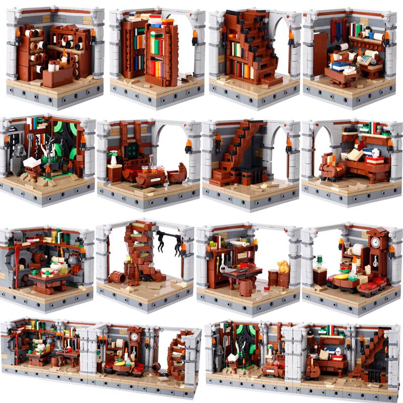 MOC Medieval Construct Accessories Building Blocks Street View House Furniture Bookstore Desk Kitchen Map Bricks Friend Toy Gift