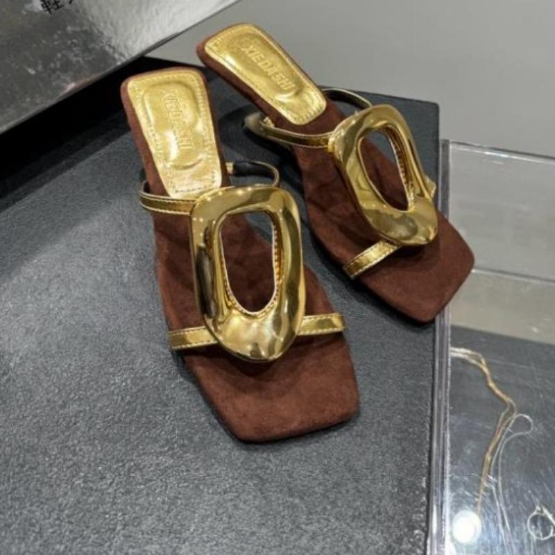Special-shaped Heel Sandals Women's Summer New Open-toed Metal Buckle with Block Heel Beach Half Slippers