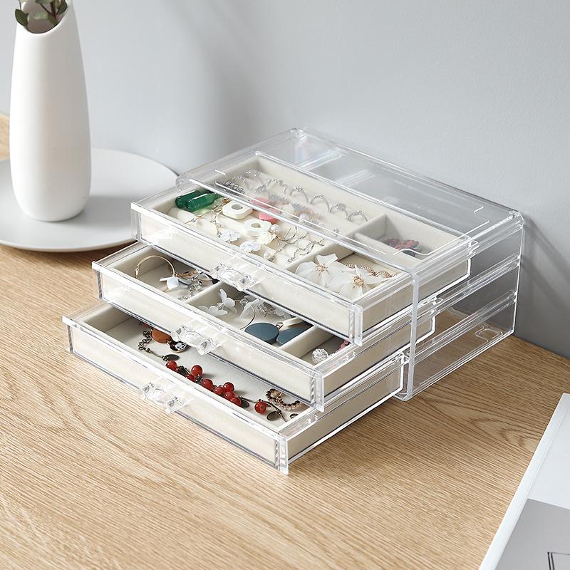 Three-Drawer Velvet Jewelry and Cosmetic Organizer with Necklace, Earring, and Ring Display