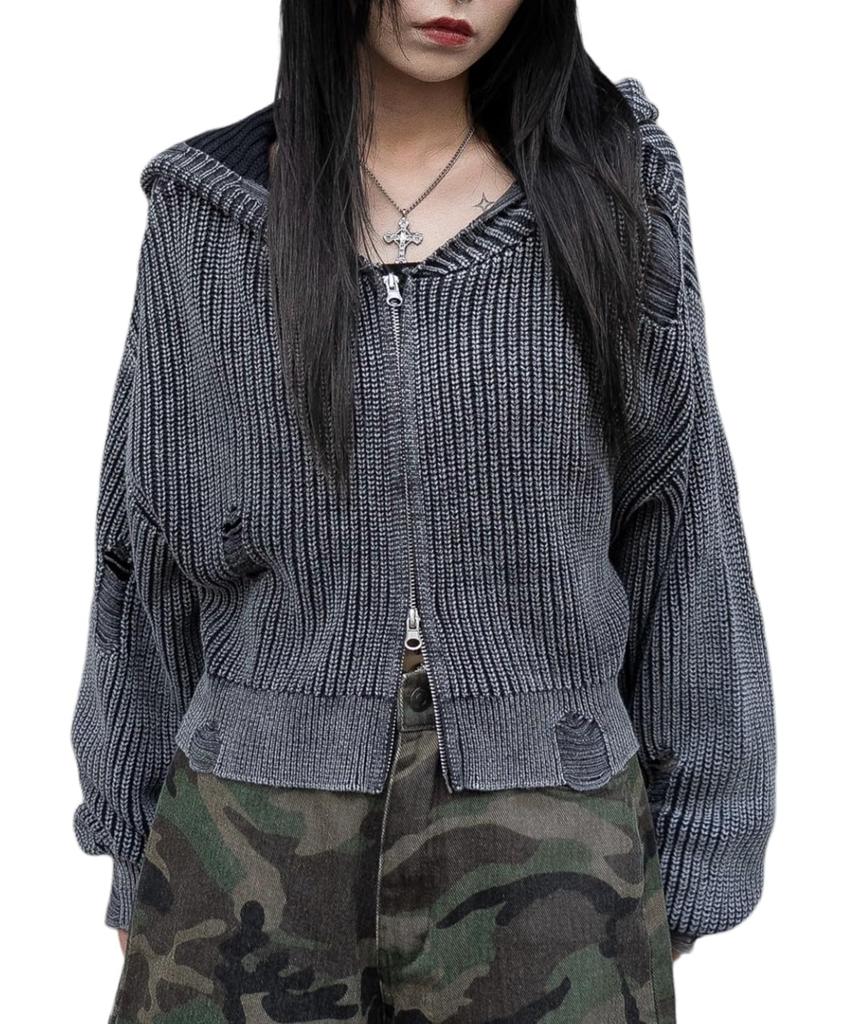 WEGO Distressed Knit Zip Size Sumikuro Women's Hoodie, Casual, Girly, Fall/Winter Outfit, F,
