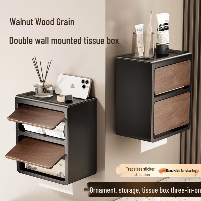 Vintage Wood Grain Wall-Mounted Tissue Box & Storage Rack - Double-Layer, Punch-Free Toilet Paper Holder