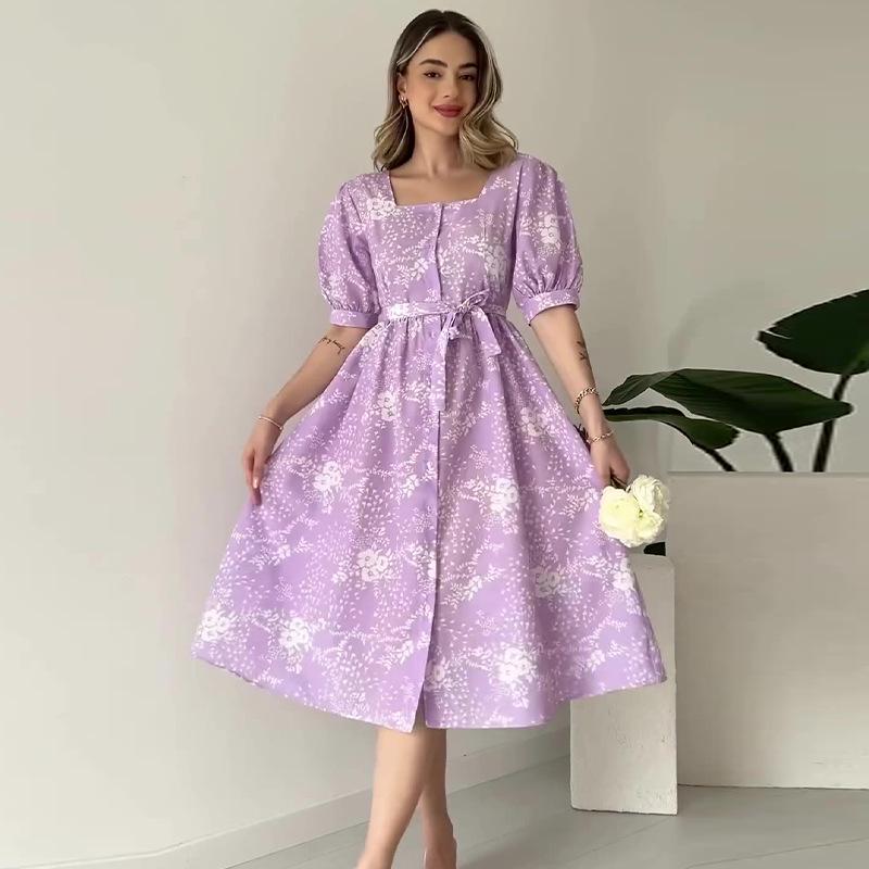 Summer 2024 Euro-American Square Neck Puff Sleeve Tie Waist Dress for Women