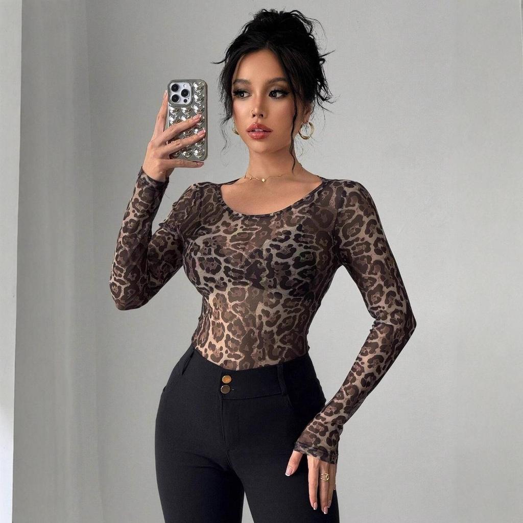 2025 Fashion Transparent Leopard Print Mesh Long Sleeve Slim Fit T-shirt