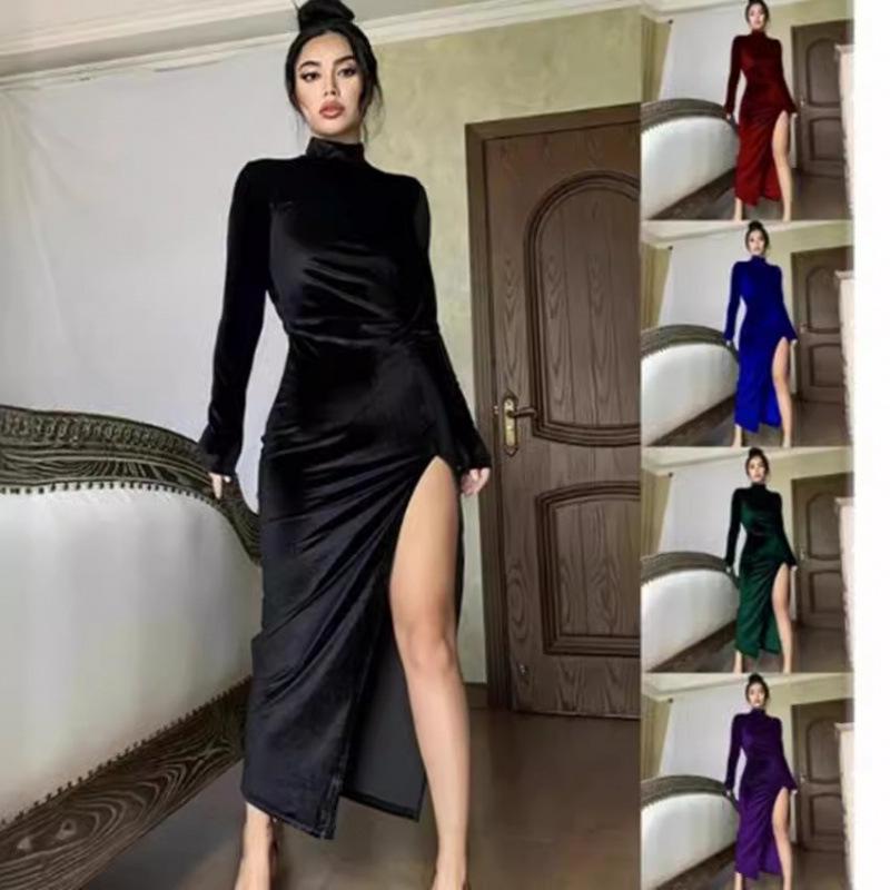 Experience elegance and sophistication with this stunning dress, crafted from luxurious gold velvet and polyester materials. Designed with a high neck and long sleeves, this slim-fit dress beautifully contours the silhouette. The ruched detailing and side slit add a touch of allure, making it perfect for special occasions or evening events. Feel confident and stylish in this exquisite piece that seamlessly combines comfort with a glamorous appeal.