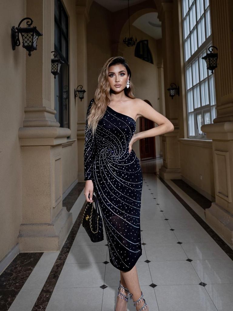 High-End Women's One-Shoulder Slimming Dress with Rhinestone Detail