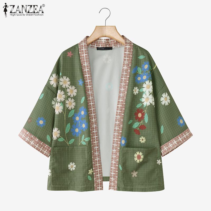 ZANZEA Women Floral Print Loose Casual 3/4 Sleeve Kimono Cardigan Blouse