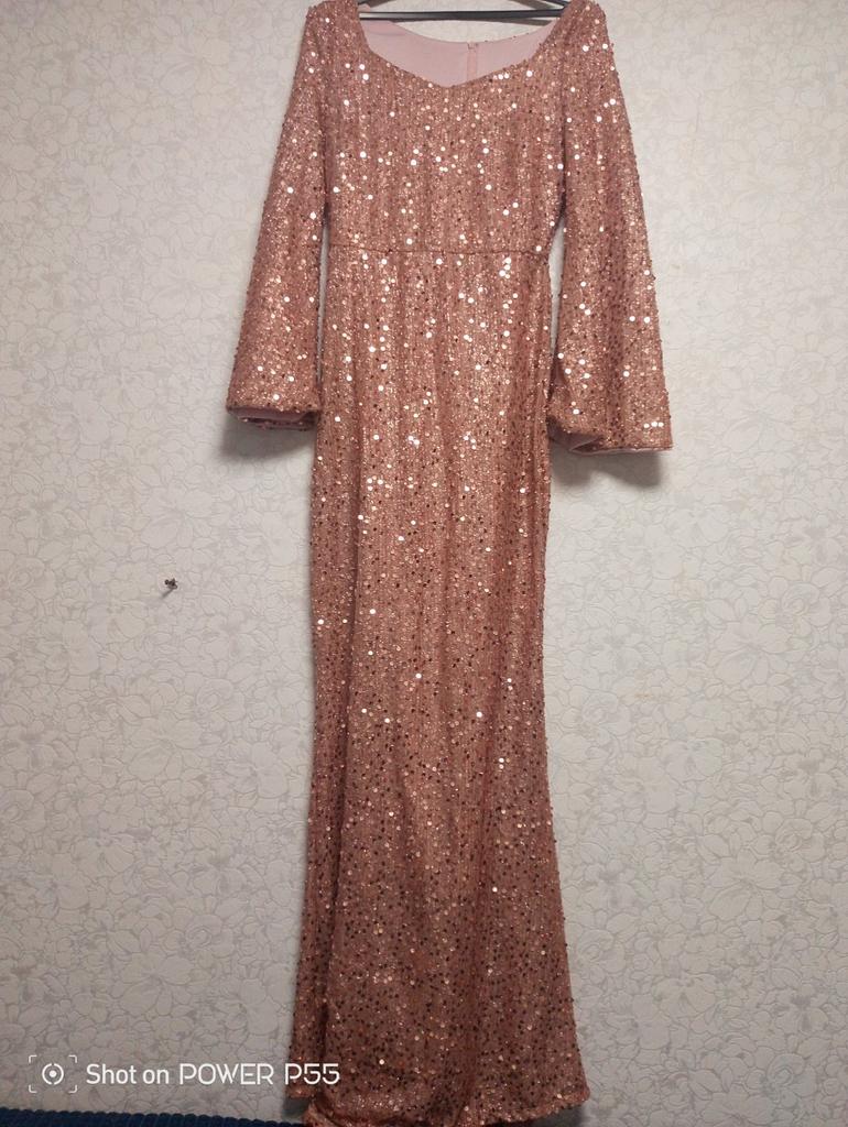 This elegant evening dress is crafted from high-quality polyester, offering a comfortable and flattering fit. The design features a stylish V-neckline and eye-catching sequins that add a touch of glamour. The trumpet sleeves further enhance the sophistication of this dress, making it an ideal choice for formal occasions and special events.